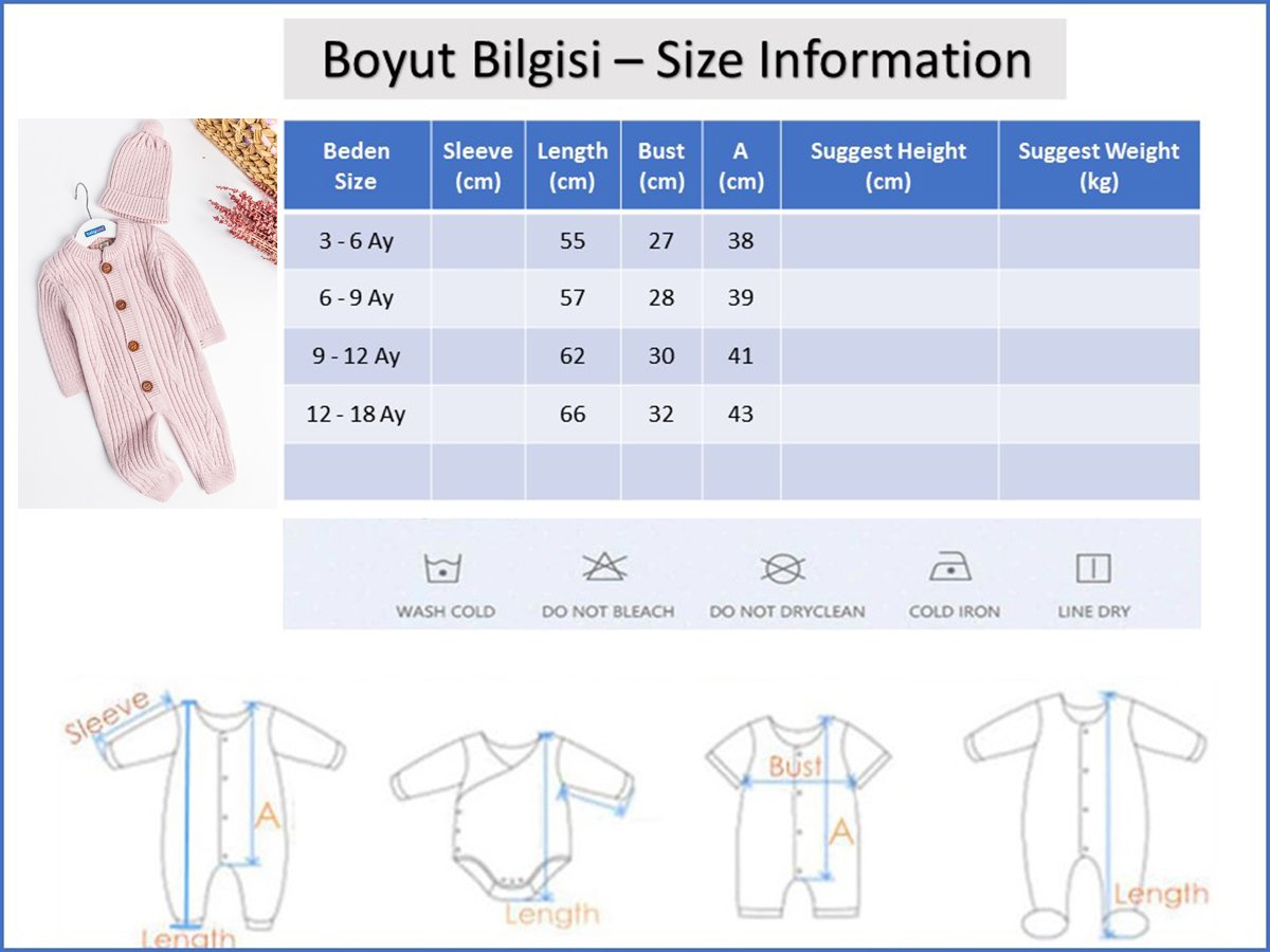 - Bebek triko tulumun ön kısmı ağ hizasına kadar düğmelidir.