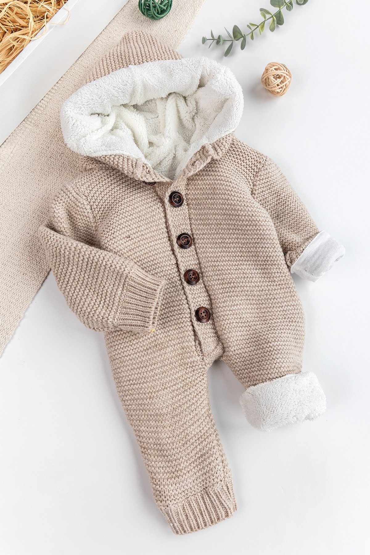Triko Örme Welsoft Astarlı Kapüşonlu Kışlık Bebek Tulum BEJ - 6 Ay