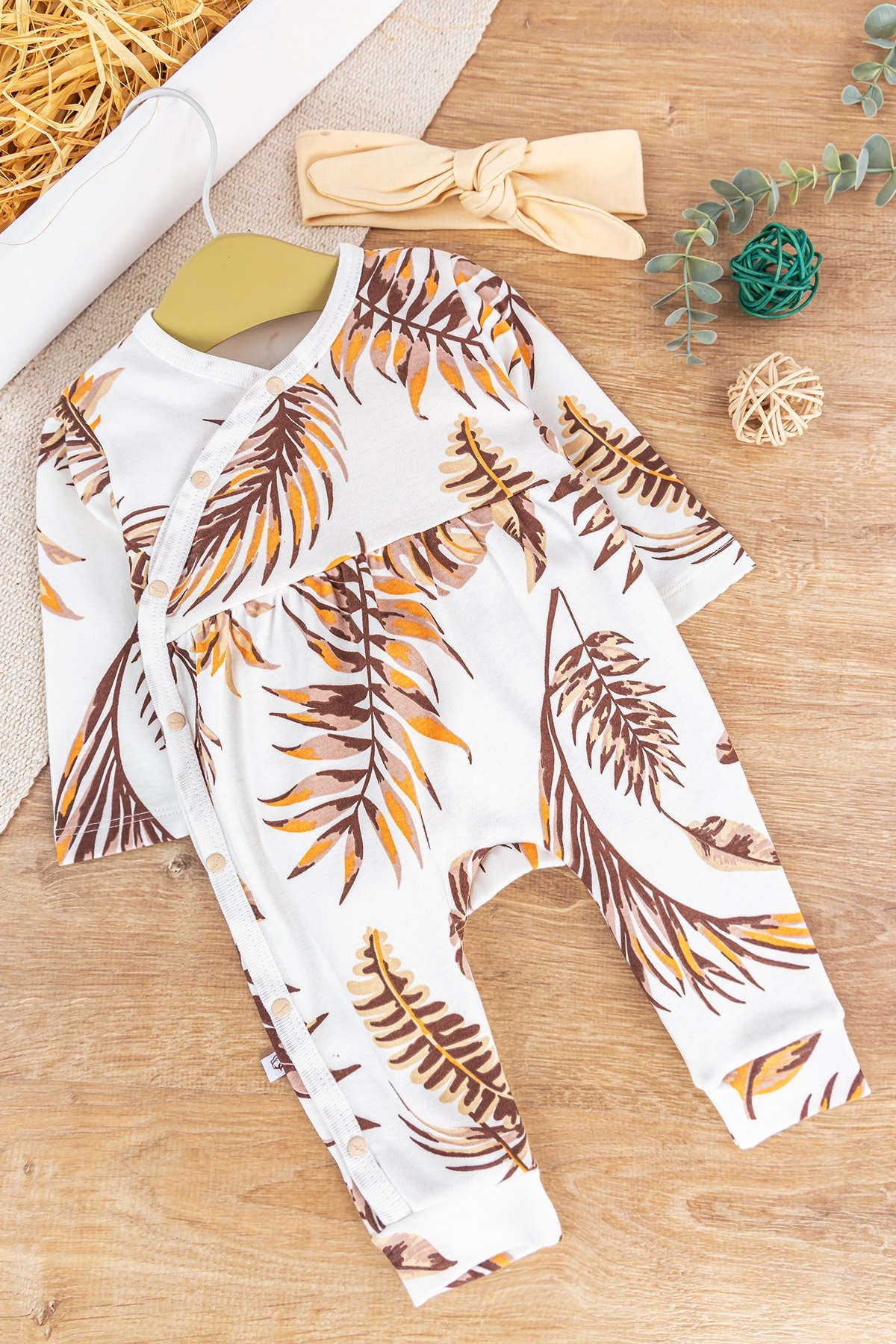 Yaprak Desenli Önden Çıt Çıtlı Bandanalı Kız Bebek Tulum